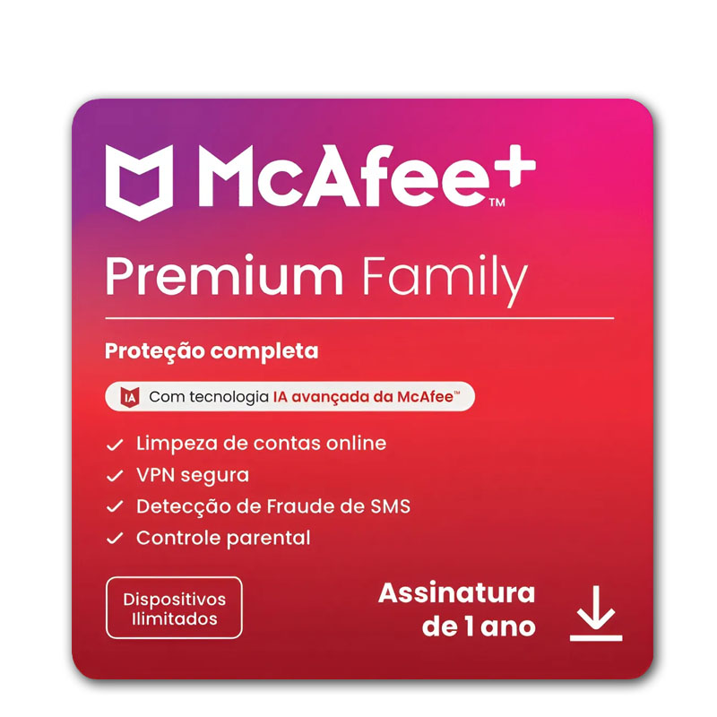 O McAfee+ Premium Family oferece proteção completa para toda a família, reunindo antivírus premiado, segurança online avançada e ferramentas de privacidade para até vários dispositivos ao mesmo tempo. Ele bloqueia vírus, malwares, phishing, sites perigosos e tentativas de invasão, além de monitorar a segurança digital de cada membro da casa. Com o sistema de Pontuação de Proteção, o McAfee identifica vulnerabilidades e orienta como corrigir cada ponto fraco, garantindo tranquilidade ao navegar, estudar, trabalhar ou fazer compras online.