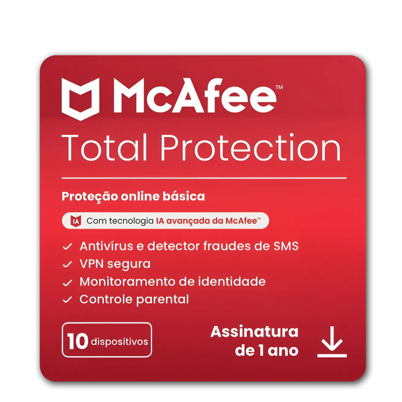 Além disso, o McAfee inclui recursos essenciais como VPN automática limitada (500 MB/mês) para proteger informações pessoais em transações e redes públicas, além de um gerenciador de senhas que cria e salva combinações fortes para suas contas. O pacote também monitora até 10 emails na dark web e envia alertas imediatos caso suas informações sejam encontradas em locais suspeitos. Ideal para quem busca uma solução completa, simples e imediata com código digital enviado por email após a compra para ativação rápida e segura. Conheça também as opções de McAfee Antivirus 1 Dispositivo, McAfee Total Protection 1 Dispositivo, McAfee Total Protection 5 Dispositivos, McAfee Total Protection 10 Dispositivos, McAfee Total Protection 10 Dispositivo + Safe Connect , McAfee Mobile Security, McAfee+ Premium Individual, McAfee+ Premium Family.